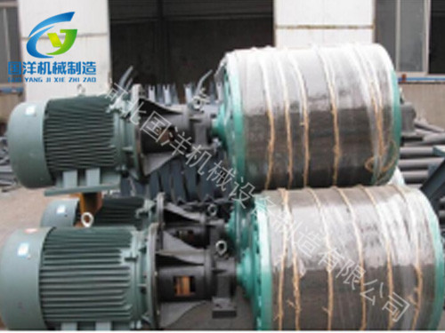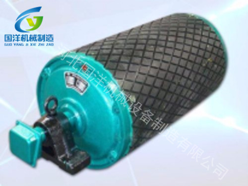 電動滾筒是輸送機傳遞動力的部件。傳動滾筒表面有裸露光鋼面,人字形和菱形花紋橡膠覆面。小功率、小帶寬及環(huán)境干燥時可采用裸露光鋼面。人字形花紋膠面摩擦系數大,性和排水性好,但有方向性。